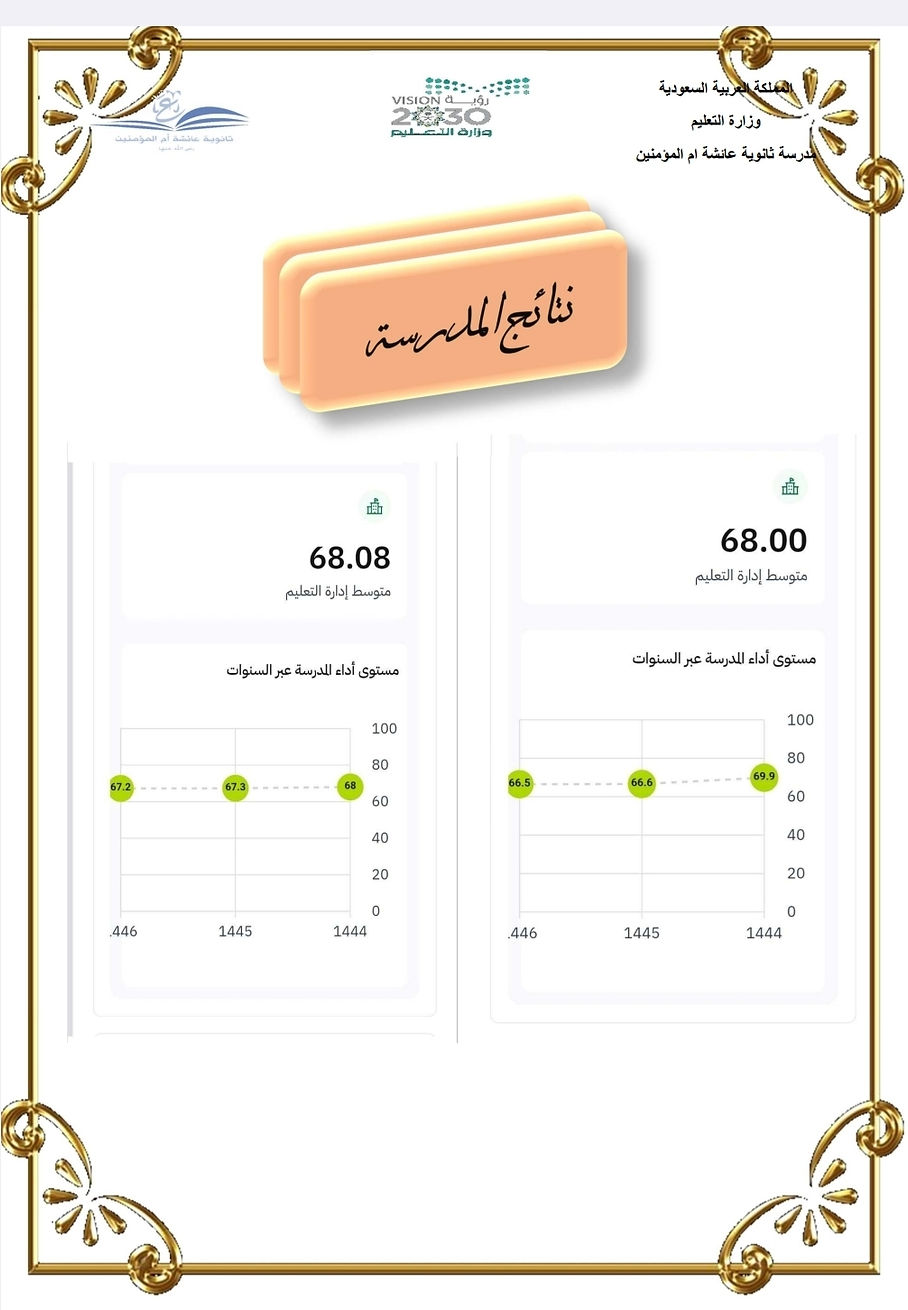 في صرحنا التعليمي، الإنجاز ليس مجرد رقم عابر، بل هو قصة نجاح تُكتب فصولها بجهد الطالبات وعطاء المعلمات. نعتز في ثانوية عائشة أم المؤمنين بأن نعلن عن نتائج حصاد ثلاث سنوات من الطموح والعمل الجاد في مقاييس الاختبارات الوطنية (قدرات وتحصيلي)، والتي جاءت لتؤكد ريادتنا واستمرارية تميزنا: